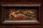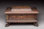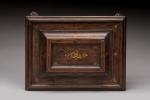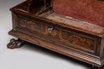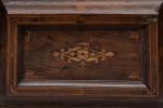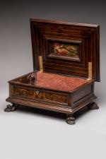 En noyer marqueté de rinceaux, mascarons et filets. Le couvercle renferme un compartiment secret et découvre au revers un tableautin figurant une divinité piquée par une flèche de l'Amour. Il repose sur des pieds griffes.