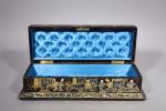 Boîte à gants en bois laqué noir à décor burgauté et doré dans le goût de la Chine de personnages dans un paysage architecturé. L'intérieur garni de soie capitonné bleu.