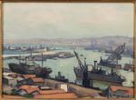 Albert MARQUET (1875-1947). Le port avec cargos, Alger.Huile sur panneau signée en bas à droite.Peint...