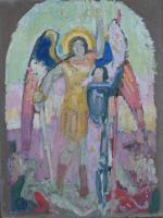 Maurice DENIS (1870-1943). Jeanne d'Arc et saint Michel. Huile sur panneau de carton signé du cachet de l'artiste en bas à gauche et au dos. Haut.: 32 - Larg.: 24 cm Provenance : Collection personnelle du sculpteur Joaquin Claret (1879-1964), praticien