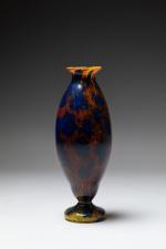 Vase en verre marmoréeen dans les tons jaunes, rouges et bleus, reposant sur un pied bulbé. Signé à la pointe.