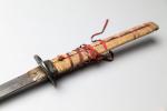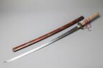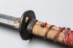 La lame : imori mune, nagako kiri, bons restes de hamon gunome, o kissaki. Habaki plaqué d’une feuille d’argent à motif rayonnant. Nagasa : 70 cm.