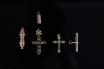 On joint un ensemble en or jaune 18k (750 millièmes) comprenant une croix pendentif piquée de perles, une pampille, un remontoir monté en broche et une broche a décor émaillé