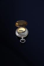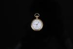 Montre de col en or jaune 18k (750 millièmes), le fond guilloché à décor rayonnant, le cadran émaillé blanc à chiffres arabes pour les heures et compteur des secondes à 6 heures. Le cache-poussière en or.
