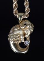 Sautoir en or jaune 18k (750 milllièmes) à maille torsadée, retenant un pendentif bélier serti d'un petit brillant.