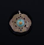 Pendentif en or jaune 18k (750 millièmes), à décor de dragons enserrant un disque bi en jadéite centré d'un idéogramme et serti d'une pierre verte ovale facettée.