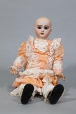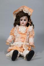 Poupée française avec tete en biscuit, bouche ouverte, moule JUMEAU, marquée "7" (attache au ressort),...