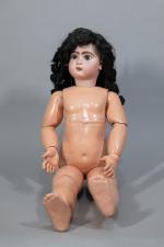 Poupée française avec tete en biscuit, bouche ouverte, marquée "14", moule JUMEAU, yeux bleus fixes...