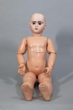 Poupée française avec tete en biscuit, bouche ouverte, marquée "14", moule JUMEAU, yeux bleus fixes et oreilles appliquées, corps articulé non d'origine d'une taille supérieure.
