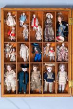 Ensemble de vingt-et-une mignonnettes et micro-mignonnettes dans leurs habits d'origine pour la plupart, avec tête et corps en biscuit ou tête en biscuit et corps en composition, fabrications française et allemande.