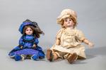 Poupée allemande avec tete en biscuit de fabrication "FLEISCHMANN", marquée "2", yeux dormeurs marrons, corps articulé SFBJ d'origine, habits anciens.
