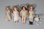 Quatre poupées diverses de bazar en biscuit avec droit ou articulé dont un corps JUMEAU...