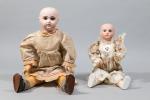 Poupée française avec tete en biscuit, bouche ouverte, marquée "1907.6", yeux fixes bleus, corps articulé en bois et composition.