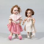 Poupée française avec tête en biscuit, bouche ouverte, marquée "AL Cie LIMOGES", yeux fixes bleus, corps articulé d'origine.