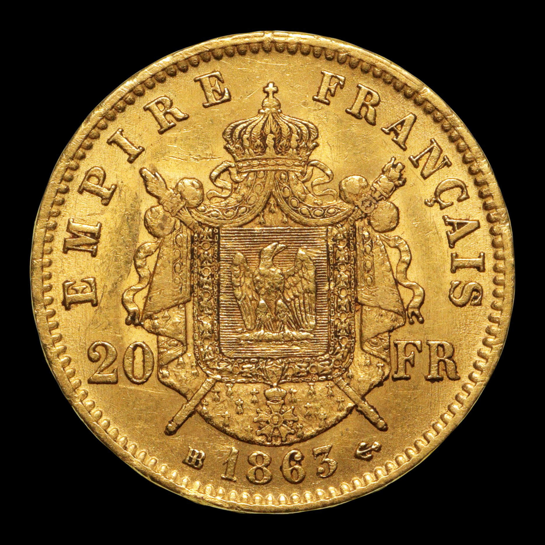 FRANCE. 1 x 20 francs or Napoléon III tête laurée, Strasbourg, 1863.