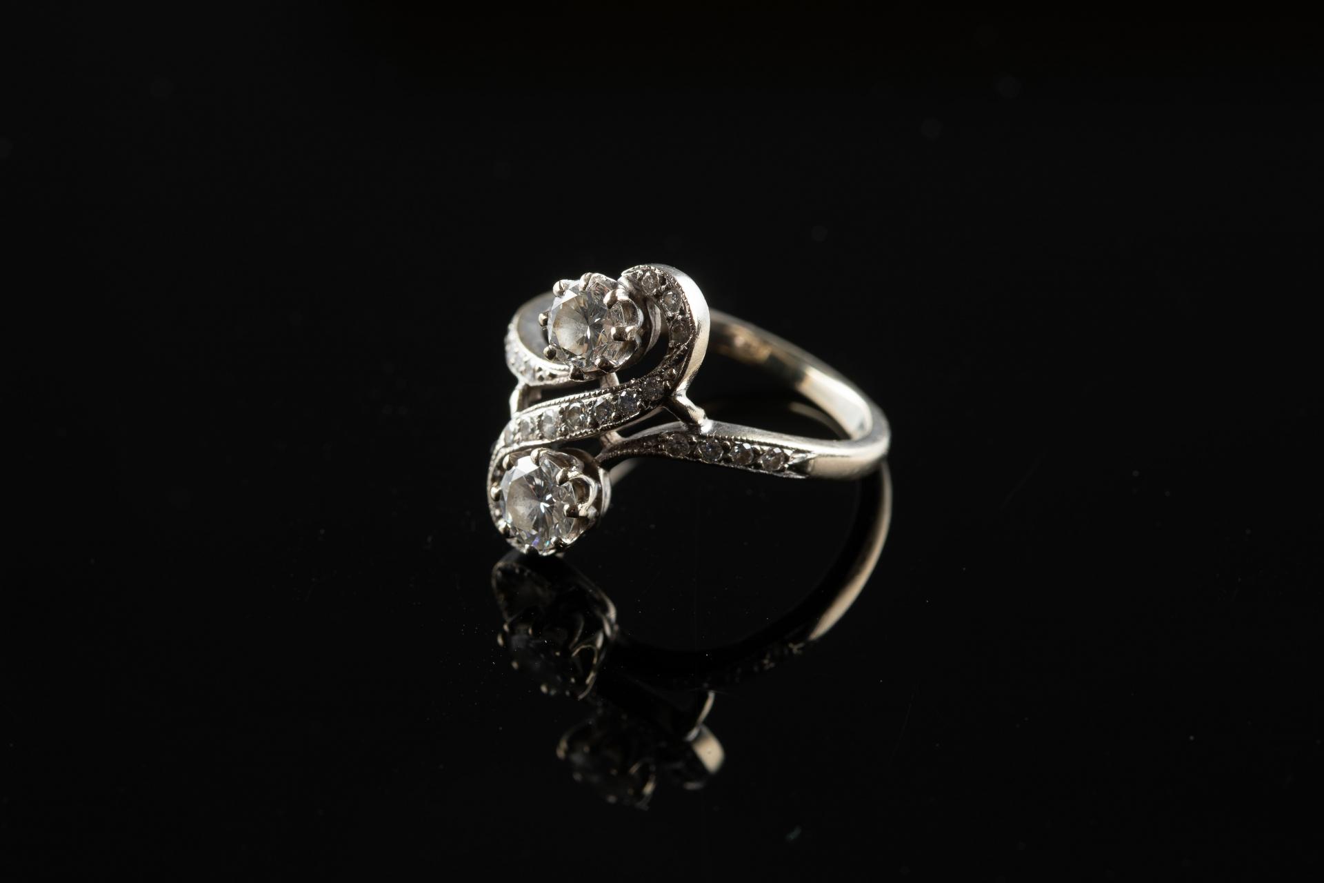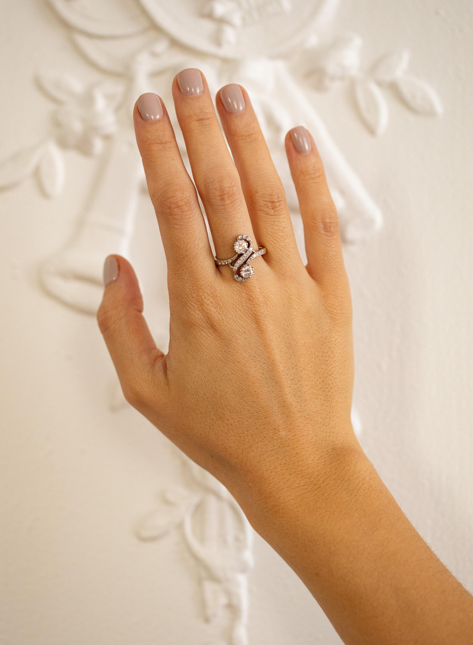 Bague toi et moi en or gris 18k (750 millièmes) griffée de deux diamants brillantés d'environ 0,40 ct dans un entourage de petits diamants brillantés.