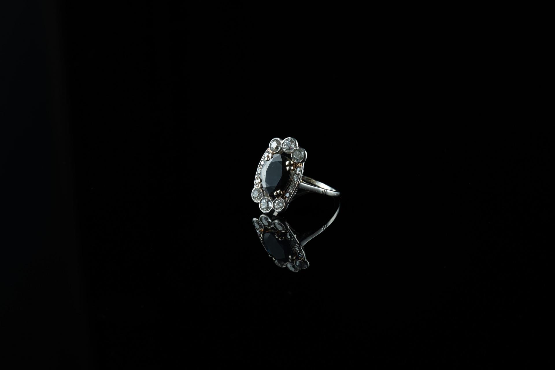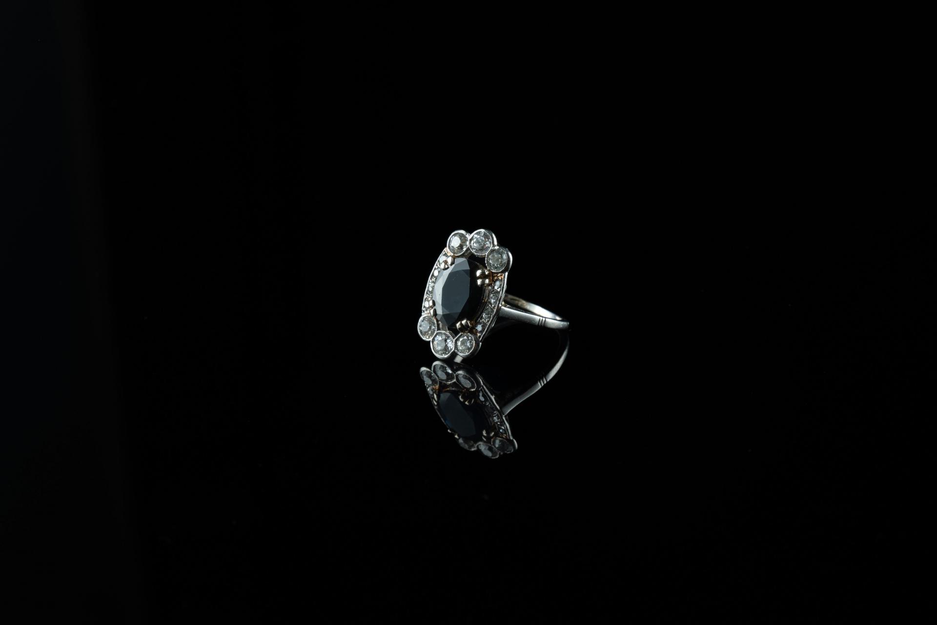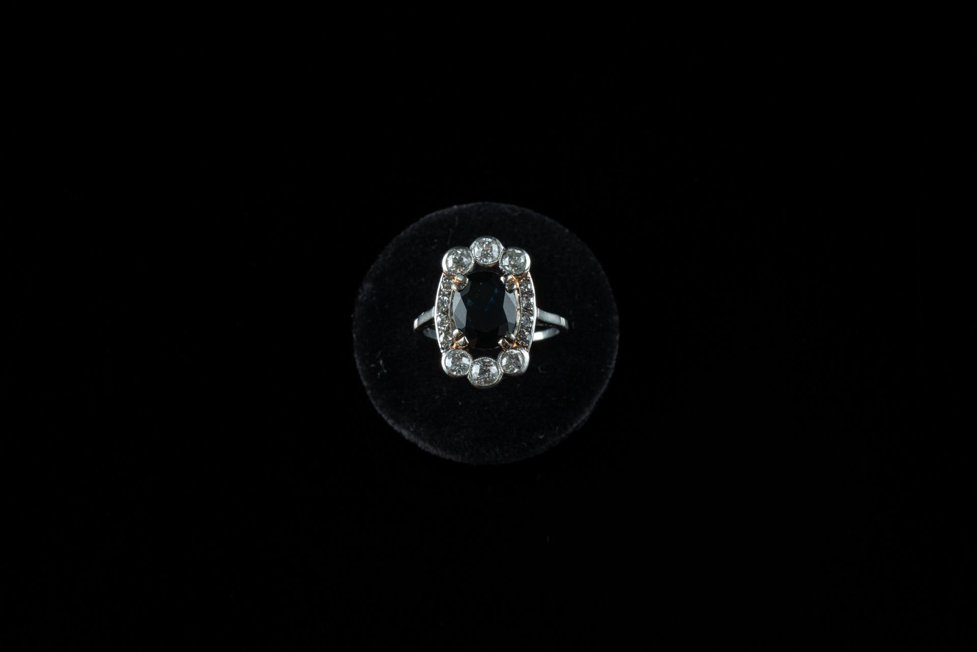 Bague en or gris 18k (750 millièmes) griffée d'un saphir épaulé de six diamants brillantés d'environ 0,10 ct et de diamants plus petits.