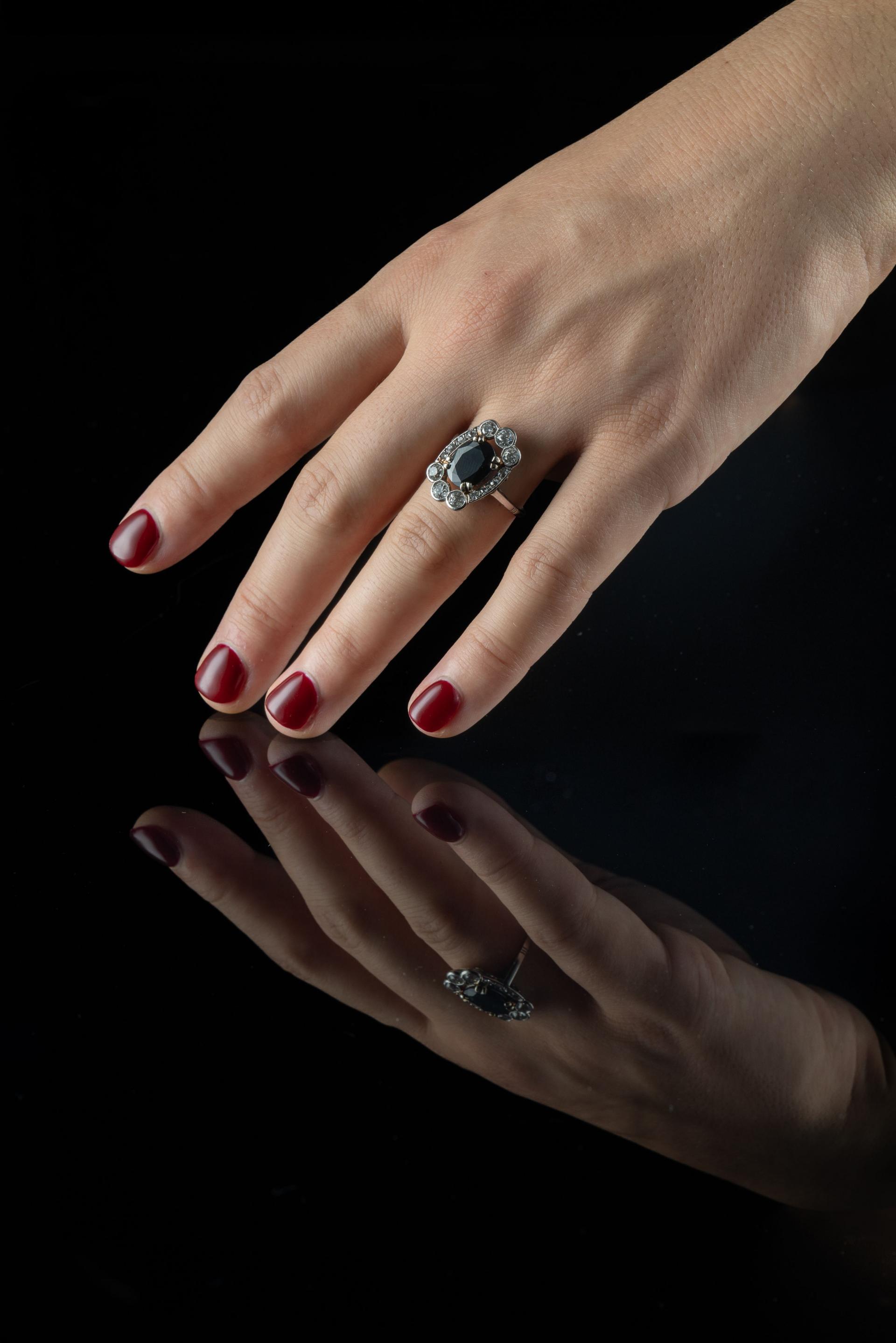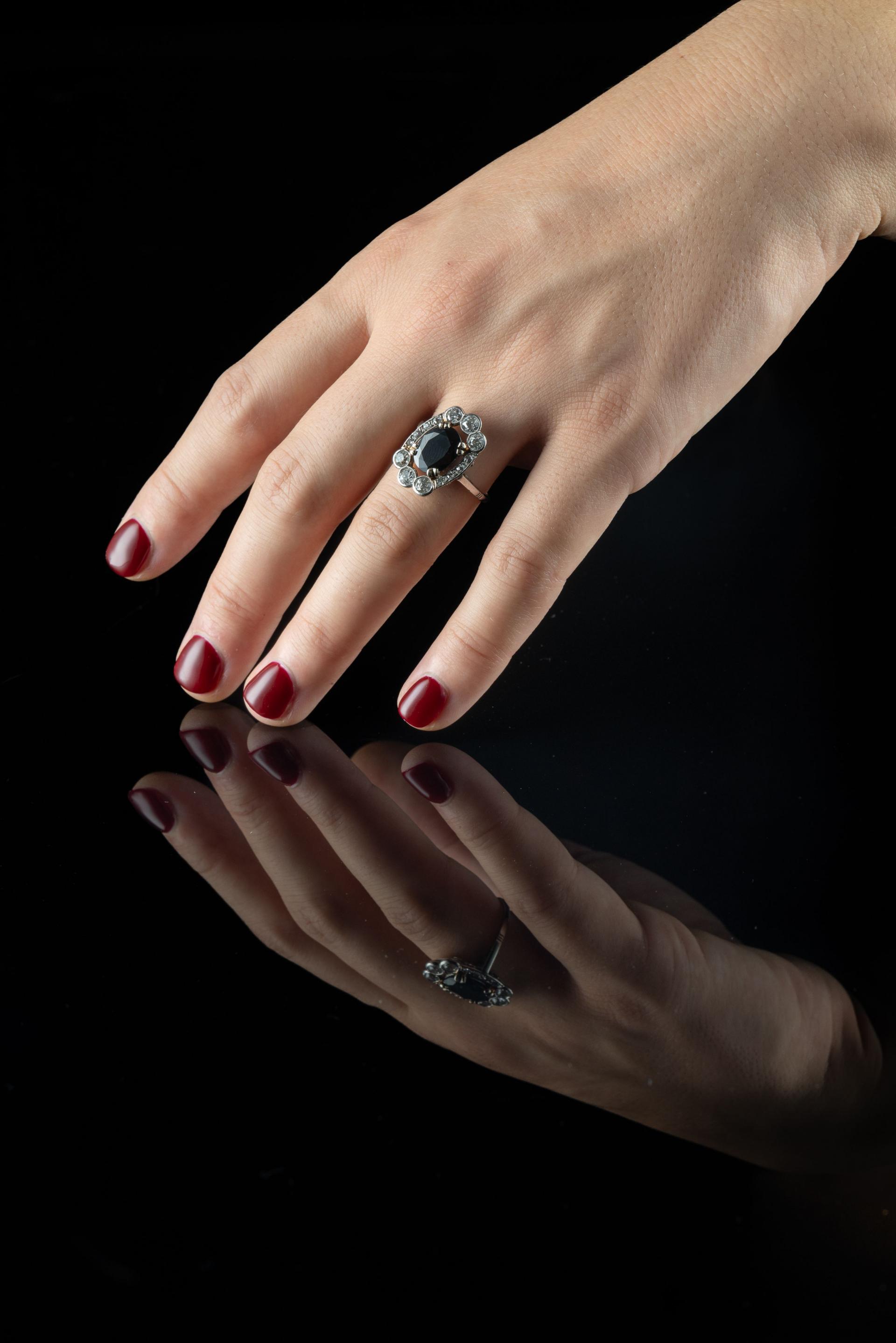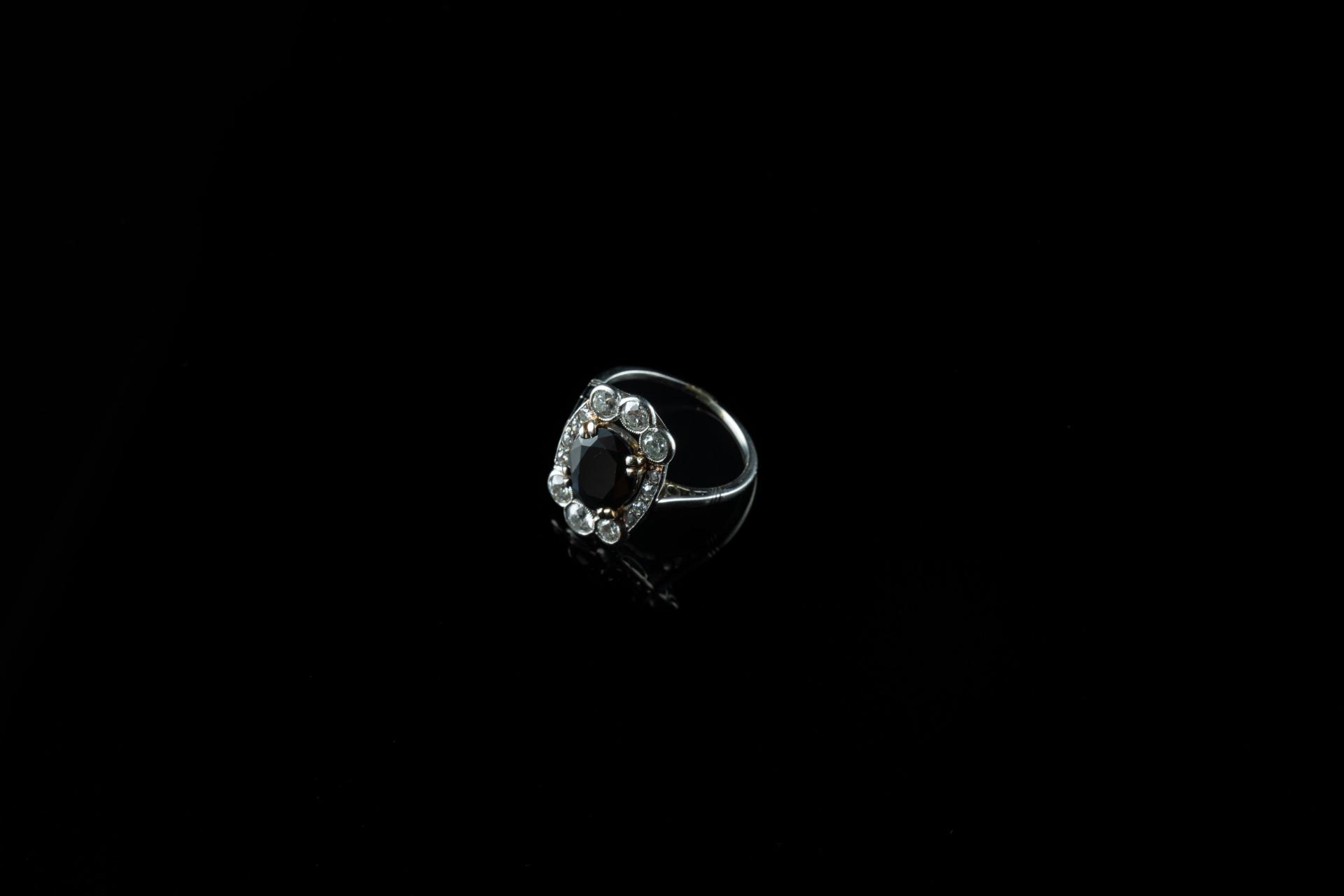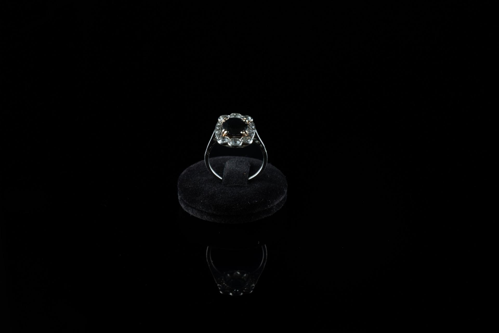 Bague en or gris 18k (750 millièmes) griffée d'un saphir épaulé de six diamants brillantés d'environ 0,10 ct et de diamants plus petits.