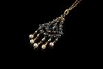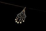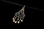 Collier en or jaune 18k (750 millièmes) retenant un pendentif griffé de pierres bleues et de cinq perles en pendeloque.