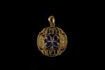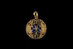 Médaille en or jaune 18k (750 millièmes) ajourée de la devise "Semper Fidelis" et centrée d'un trèfle serti de saphirs.
