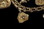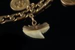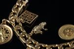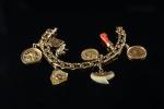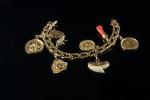 Bracelet en or jaune 18k (750 millièmes) à maille gourmette retenant huit breloques dont Figa en corail, médaillons au signe du Cancer, dent de requin, grenouille, médaille au putti et 20 francs or Napoléon.
