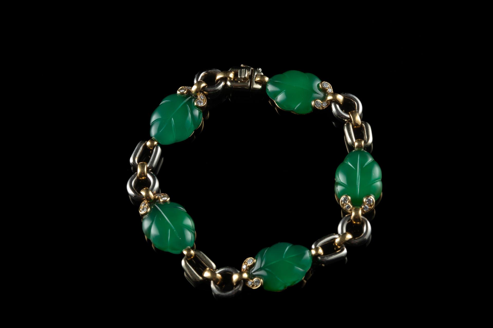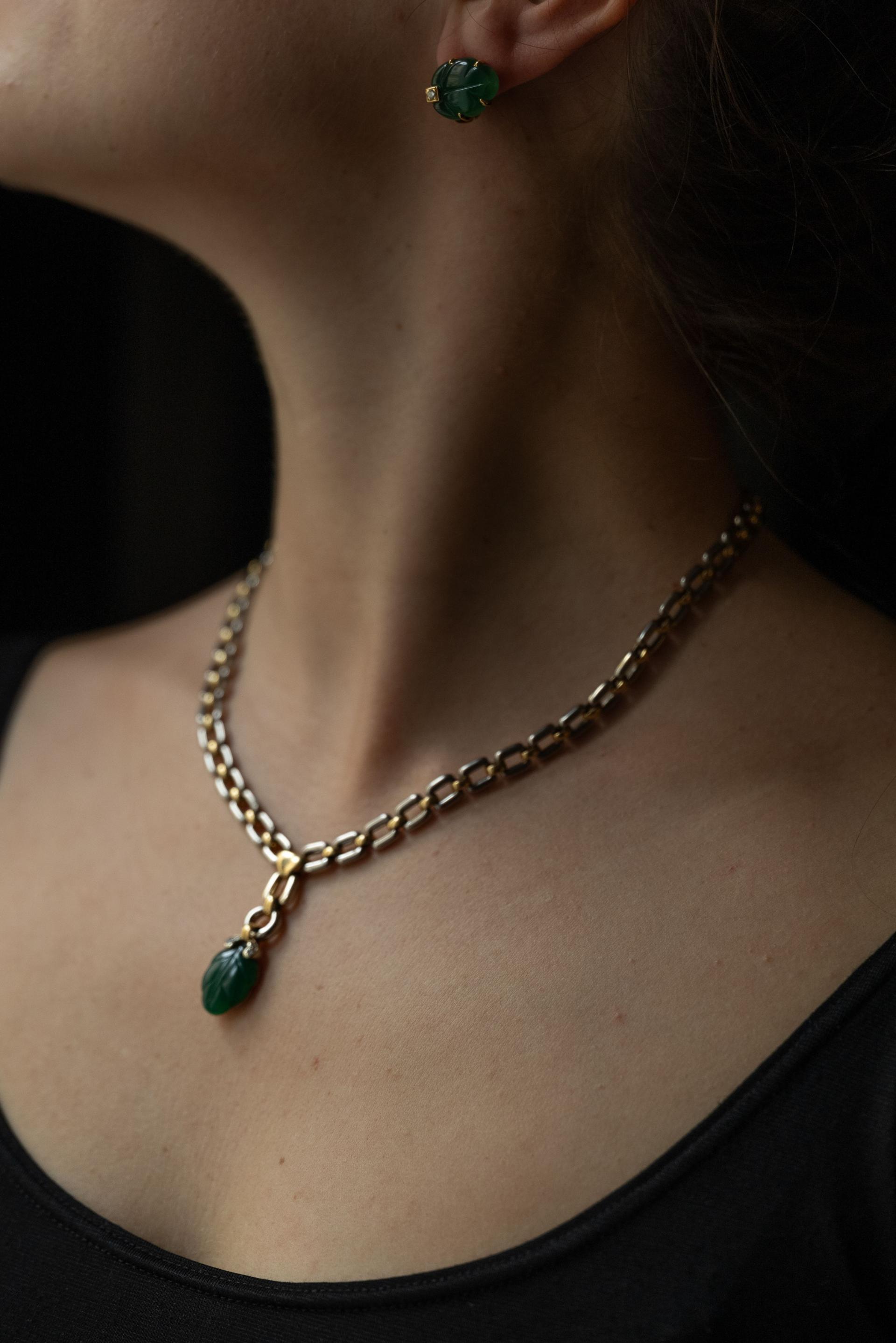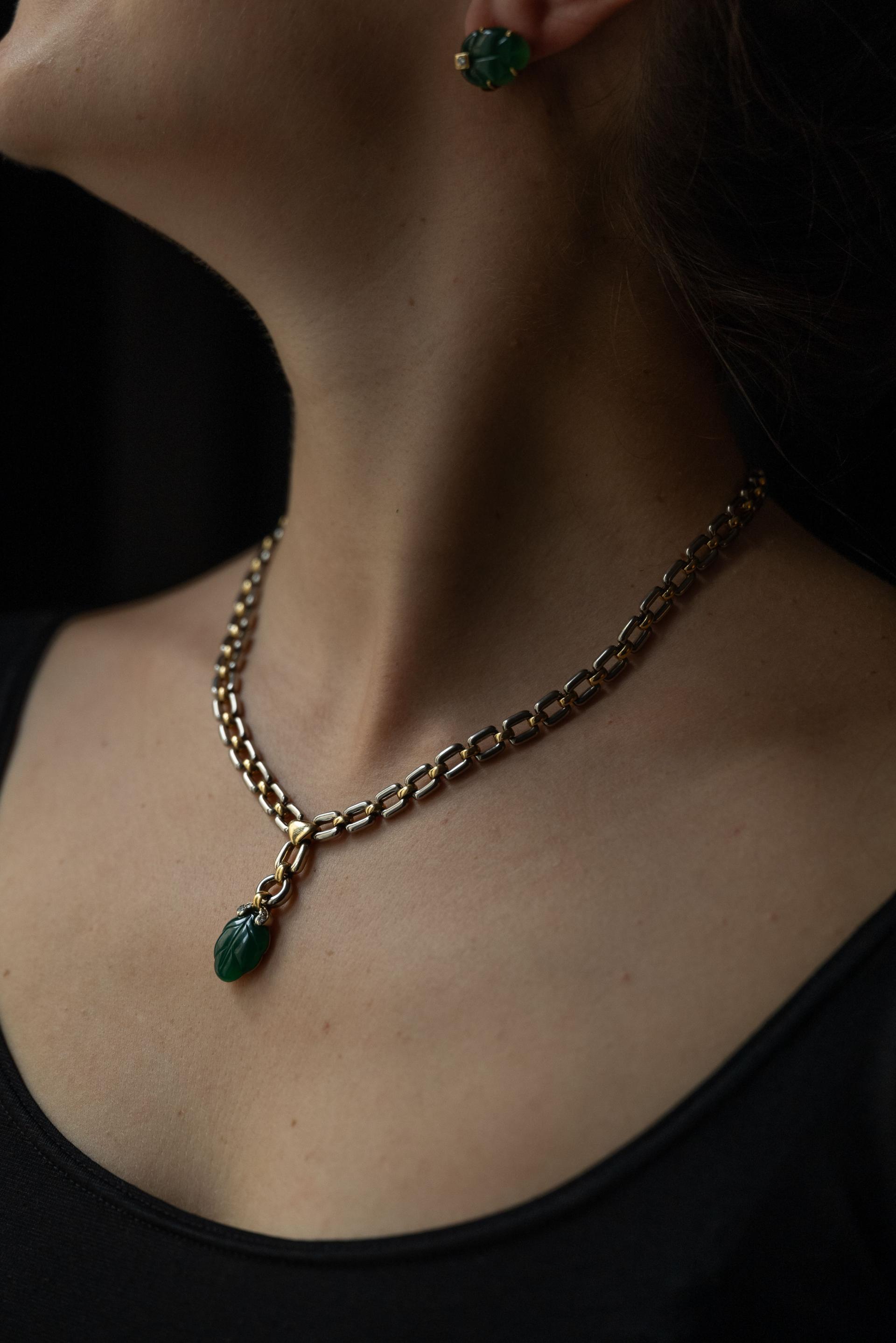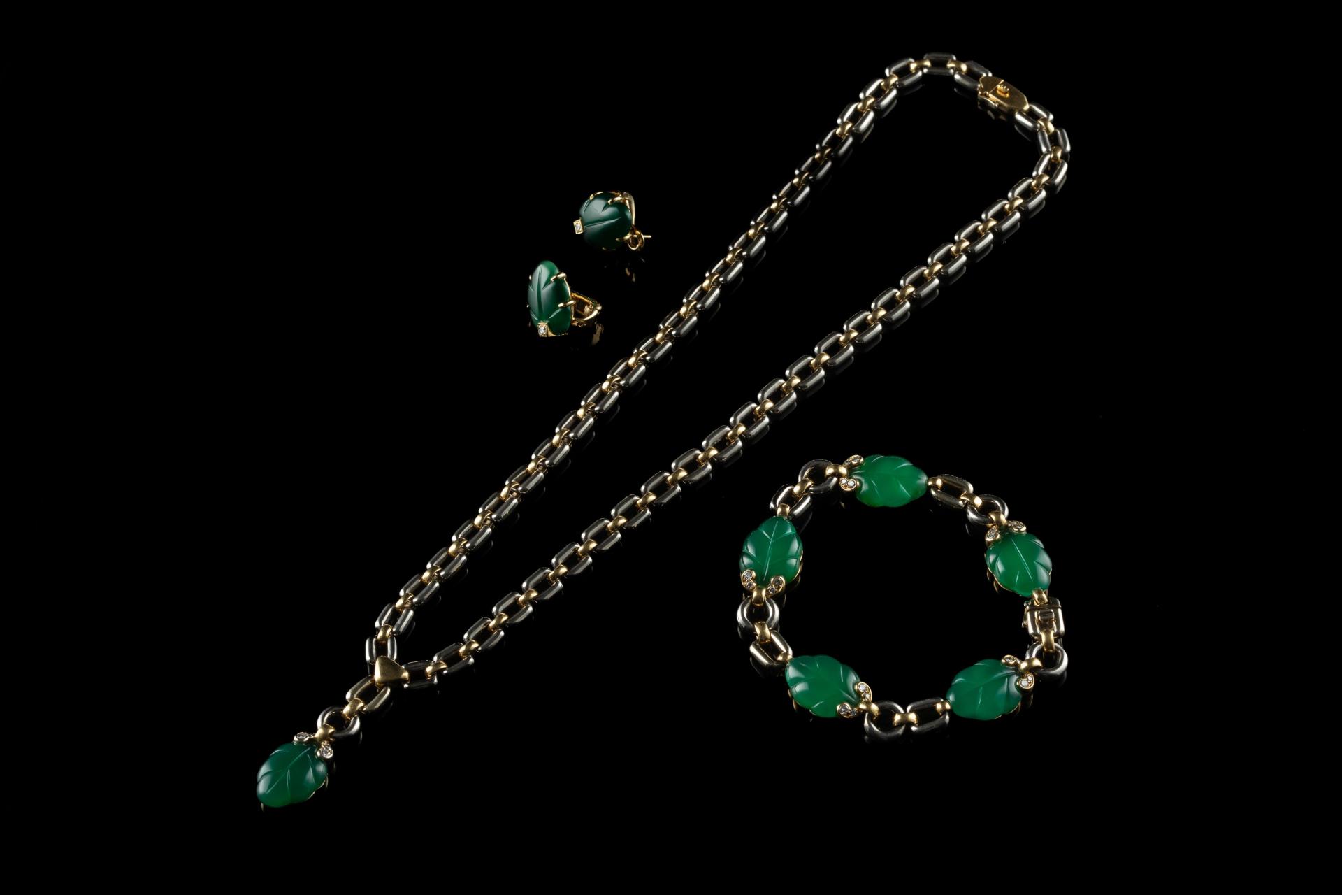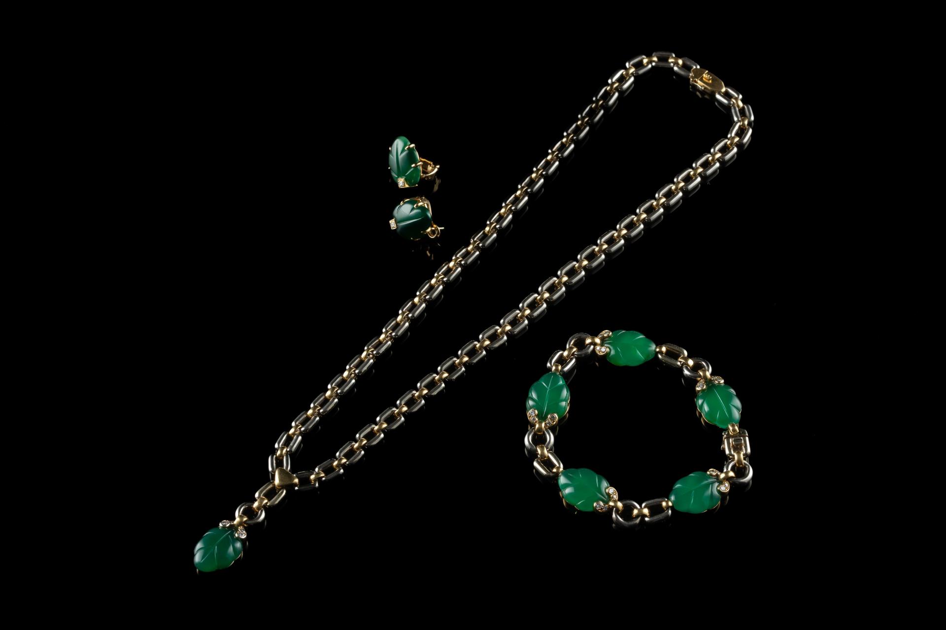 Parure en or jaune et gris 18k (750 millièmes) modèle "Ravana" sertie d'agate verte gravée simulant des feuilles soulignées de petits diamants. Elle comprend : un collier, un bracelet et une paire de boucles d'oreilles. Signée, numérotée et datée 1990.