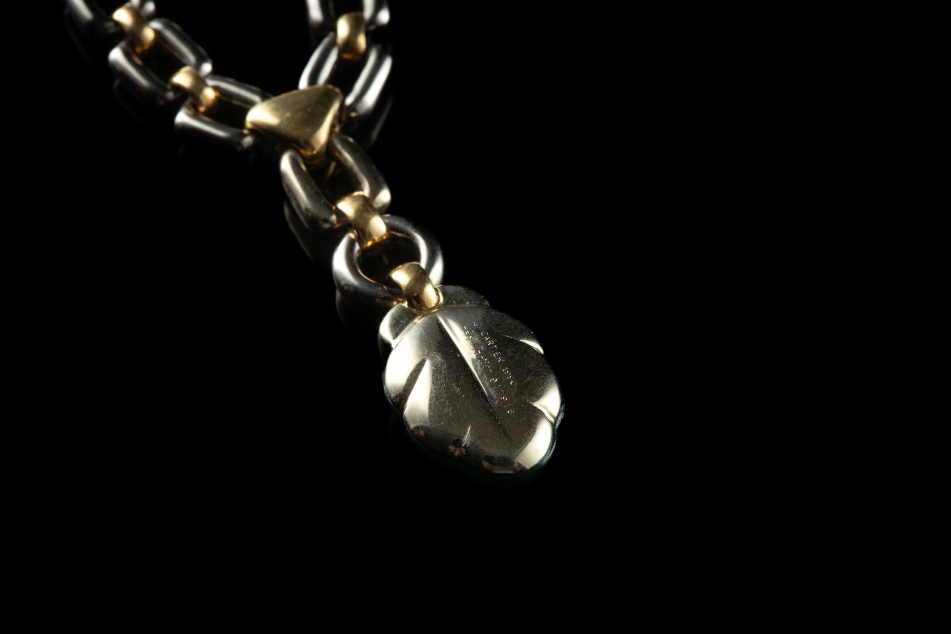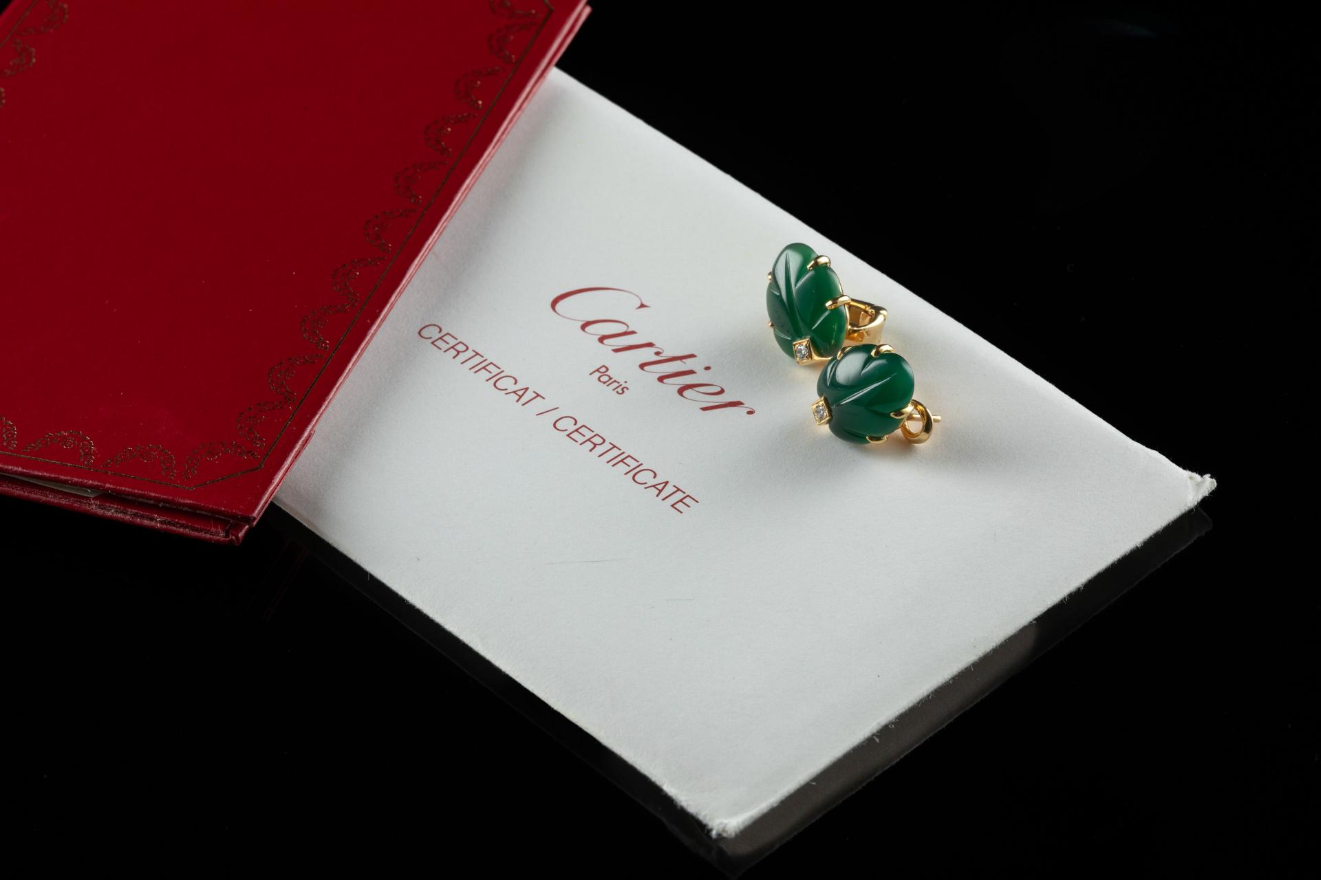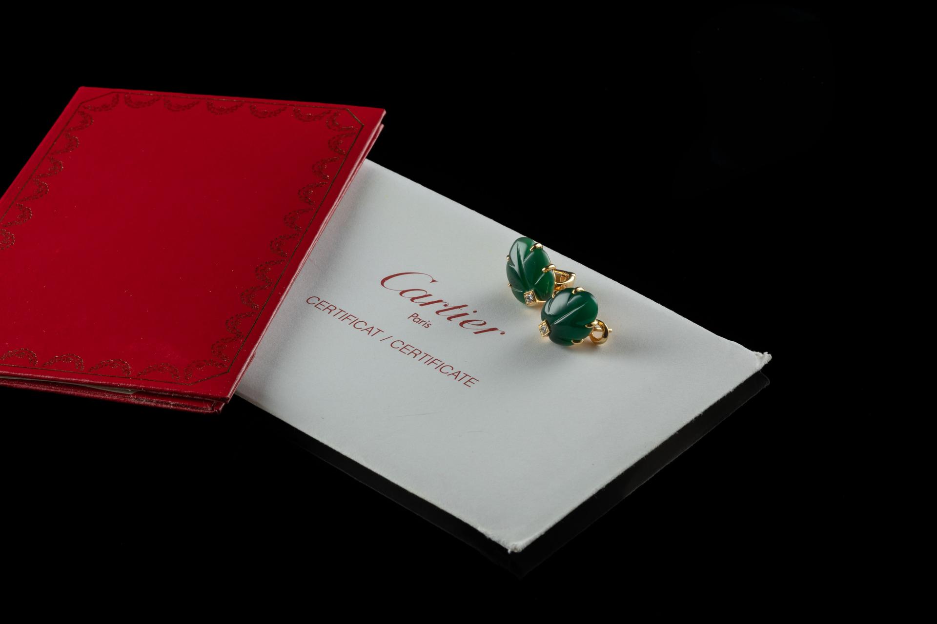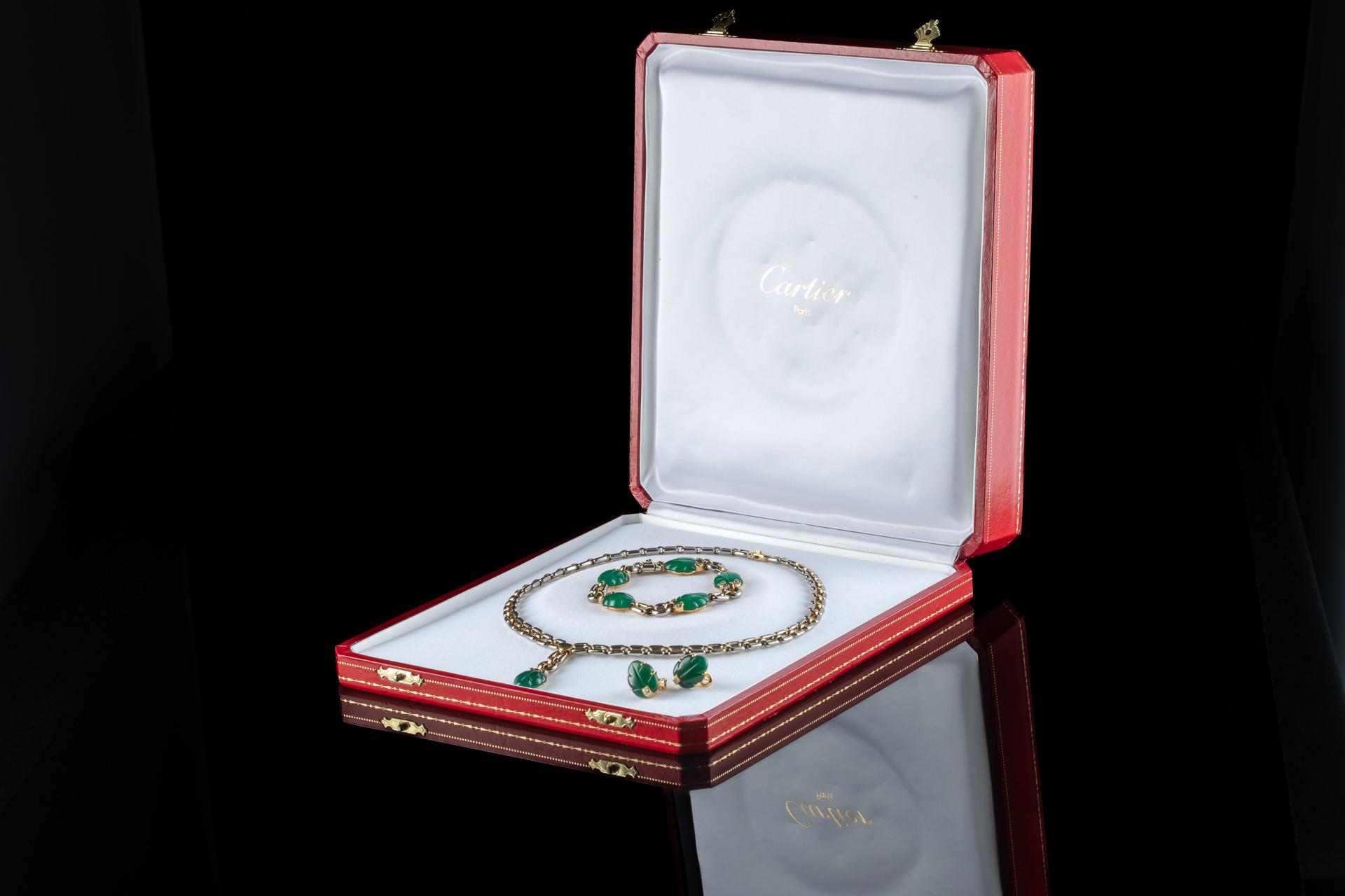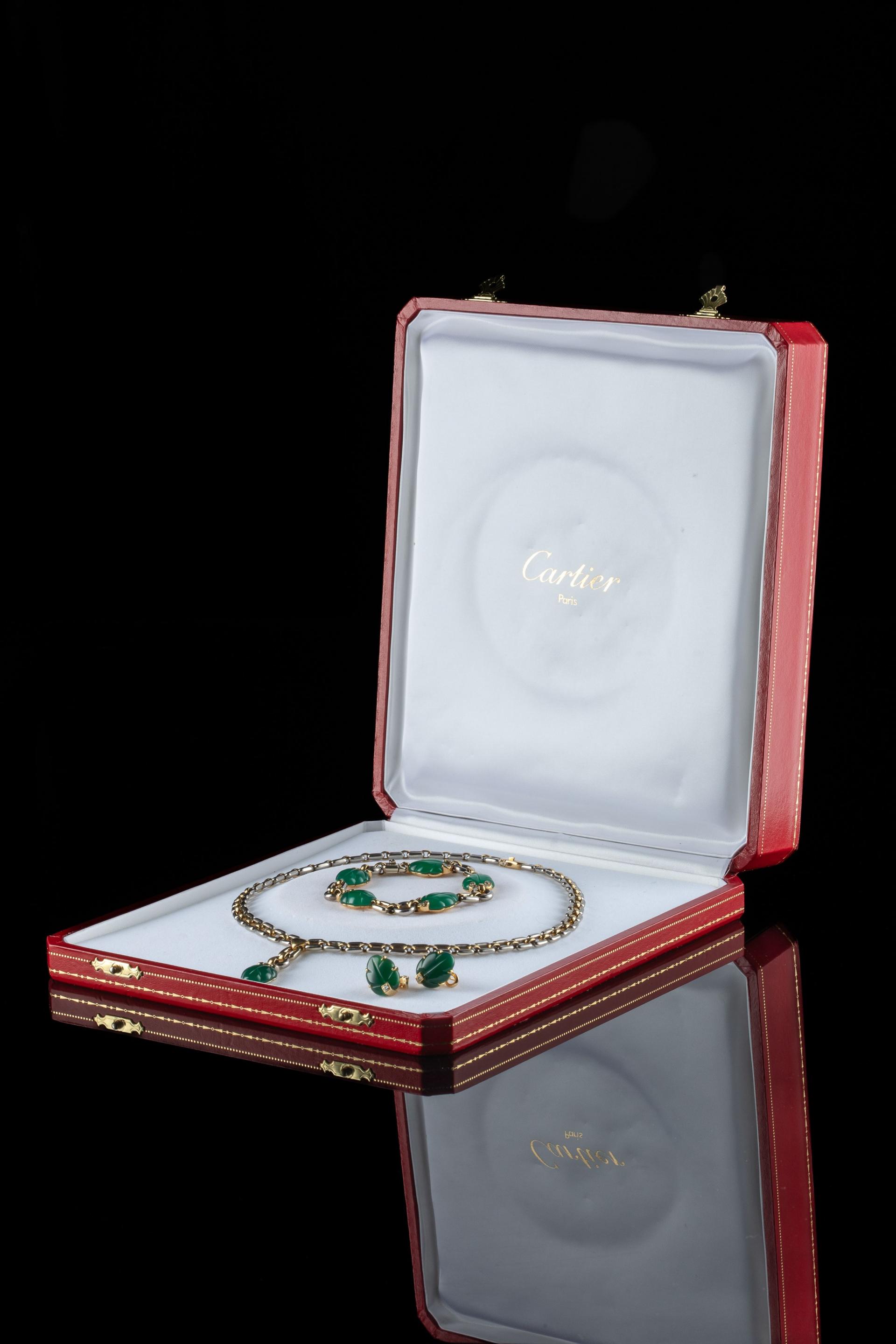 CARTIER. Parure en or jaune et gris 18k (750 millièmes) modèle "Ravana" sertie d'agate verte...