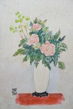 - Une aquarelle originale de Mai-Thu, signée à l'encre, représentant un bouquet dans un vase (165 X 120 mm). Elle est entourée d'un passe-partout spécial et placée dans une chemise rigide (260 X 170 mm) couverte de soie noire, portant sur le plat en lettres d'or, la mention "Aquarelle de Mai-Thu".
