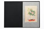 - La suite des huit cahiers sur japon nacré, contenant les huit lithographies en couleurs sur soie signées dans la planche, dans une chemise rigide (260 X 170 mm) couverte de soie noire, titrée sur le plat "Suite sur soie".