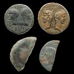 Monnaies gallo-romaines, lot de 4 dupondius : 3 de Nîmes, 1 de Lyon