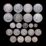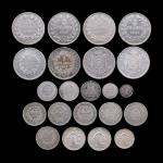 Monnaies françaises, lot de 22 pièces argent : 1/4 franc Louis-Philippe (1845B), 1/2 franc Louis-Philippe (1845A), 1 franc Charles X (1827L), 1 franc Louis-Philippe (1837K), 1 franc Napoléon III (1853A), 1 franc Semeuse (1899), 2 francs Cérès (1870A, 1871A, 1871K, 1871K, 1871K, 1872A), 2 francs Semeuse (1898, 1899), 5 francs Louis-Philippe (1841K, 1843W, 1843W, 1847A), 5 francs Napoléon III (1869BB, 1869BB), 5 francs Hercule (1873A, 1874A)
