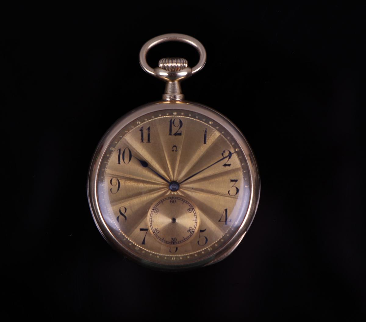 OMEGA. Montre de gousset en or jaune 18k (750 millièmes), le cadran doré à chiffres...