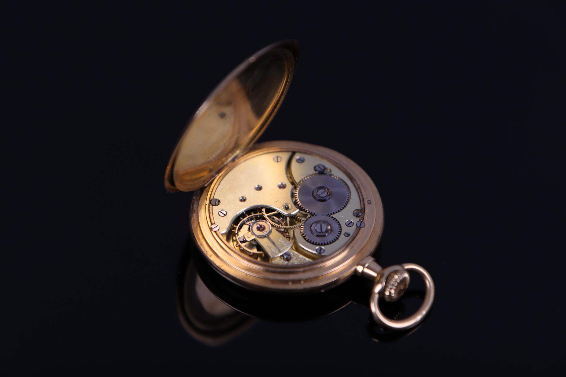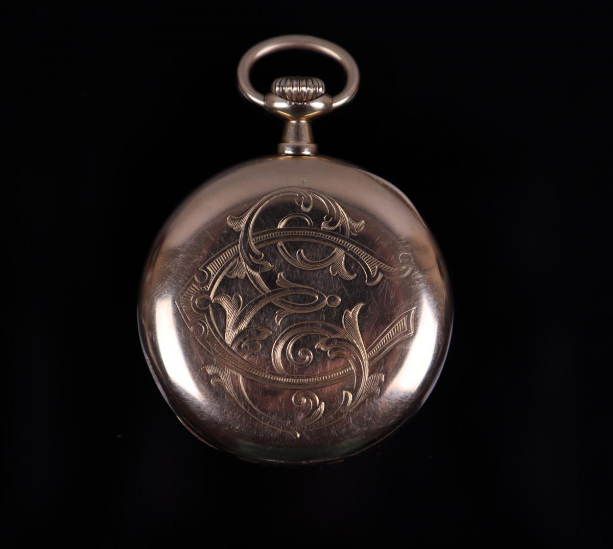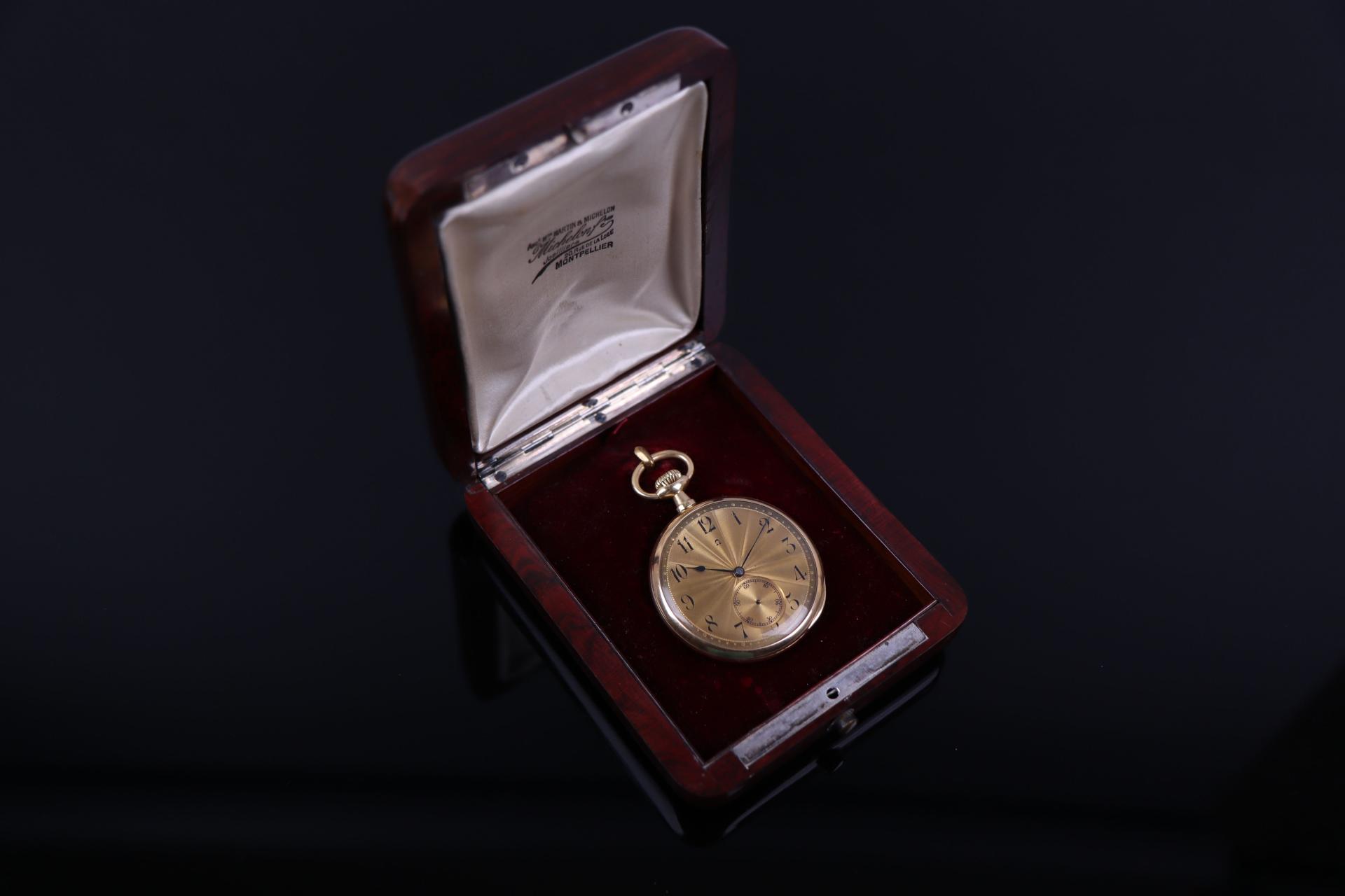 Montre de gousset en or jaune 18k (750 millièmes), le cadran doré à chiffres arabes pour les heures, compteur des secondes à six heures. Le cache-poussière en or. Le dos finement ciselé du monogramme "CE".