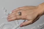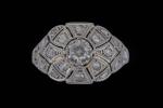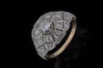 Bague dôme en or jaune et gris 18k (750 millièmes), le chaton ajouré de forme géométrique pavé de petits diamants taillés en rose et griffé en son centre d'un diamant brillanté.