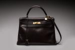 Sac "Kelly" retourné en box marron, bijouterie en métal...