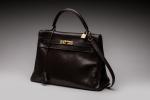 HERMES. Sac "Kelly" retourné en box marron, bijouterie en métal plaqué or, poignée, bandoulière et...