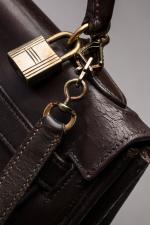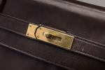 Sac "Kelly" retourné en box marron, bijouterie en métal plaqué or, poignée, bandoulière et clés sous clochette.