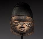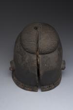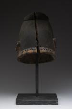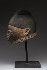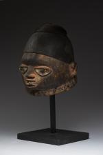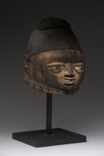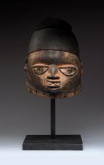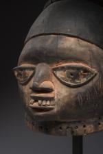 YOROUBA, NIGERIA. Masque heaume Gelede. Bois et pigments.Rare figure expressive et spectaculaire scarifiée, traitée en...