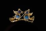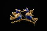 Broche en or jaune 18k (750 millièmes) et cabochons de lapis-lazuli à décor de deux oiseaux branchés, les yeux sertis clos de pierres rouges.