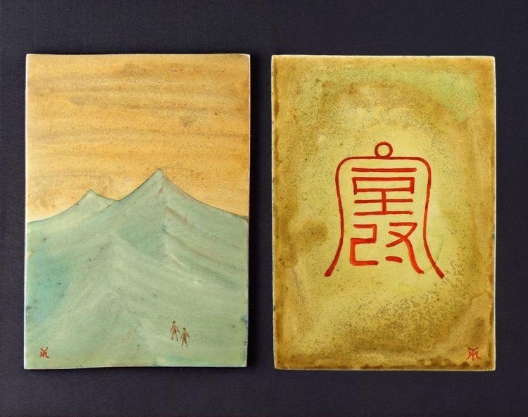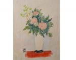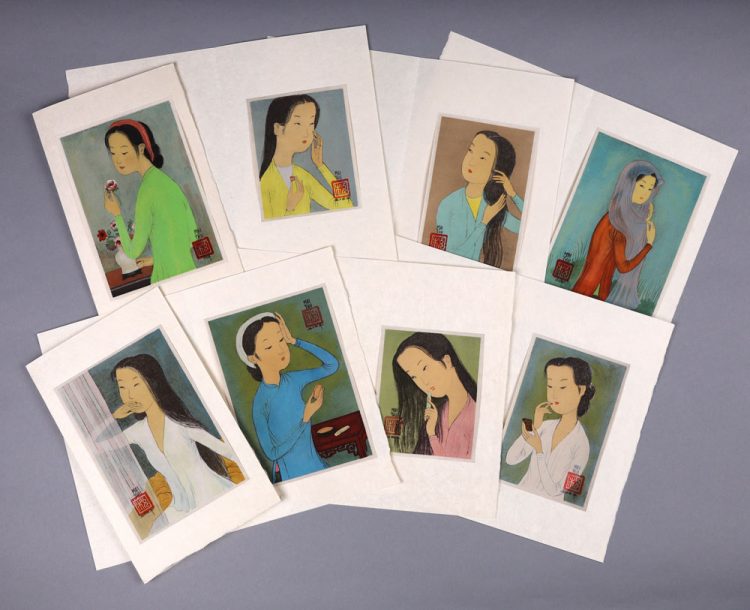 Romain Rouquet : Le rapprochement avec la peinture moderne vietnamienne peut-être opéré avec les sujets des œuvres du coffret. Sur les deux séries de lithographies, j’observe des jeunes femmes dans des scènes plutôt intimistes. La composition est toujours simple, constituée d’aplats de couleurs. Je note que l’impression est réalisée sur de la soie. L’aquarelle figure un bouquet de fleurs dans un vase, dans une composition également très sobre, sans fond. Elle aussi est sur soie et entourée d’un joli passe-partout. Enfin, les deux laques figurent pour l’une, un paysage de montagnes dans les tons verts sur fond jaune avec deux petits personnages, et pour l’autre un idéogramme asiatique sur fond jaune et doré. On est face à des œuvres épurées, à la composition soignée, se situant à la confluence de la tradition vietnamienne et de l’art occidental.
