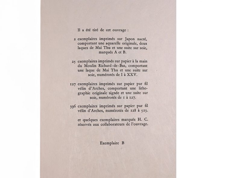 Romain Rouquet : Bien que l’ensemble soit marqué par le Vietnam, l’ouvrage a bien été réalisé en France, Mai-Thu s’y étant installé depuis la fin des années 1930, de même que l’écrivain Pham Van Ky. A cela, il faut ajouter que les impressions ont été faites par des ateliers français, à savoir les Ateliers de l’Ibis pour les lithographies, et l’Imprimerie Daragnès à Montmartre pour le texte. A noter que six peintures originales illustrant le recueil appartiennent à la famille Windsor.